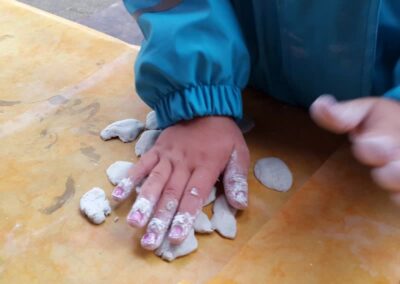 Dem Kind bietet sich so die Möglichkeit sich zurückzuziehen, zu beobachten, seinen eigenen Rythmus zu leben und auf seine Art am Geschehen teilzunehmen. Um die grosse Kreativität der Kinder zu unterstützen aber nicht zu beeinflussen, bestimmen sie die Aktivitäten weitgehend selbst. Ich biete ihnen dazu einen grossen Freiraum und klare Grenzen.